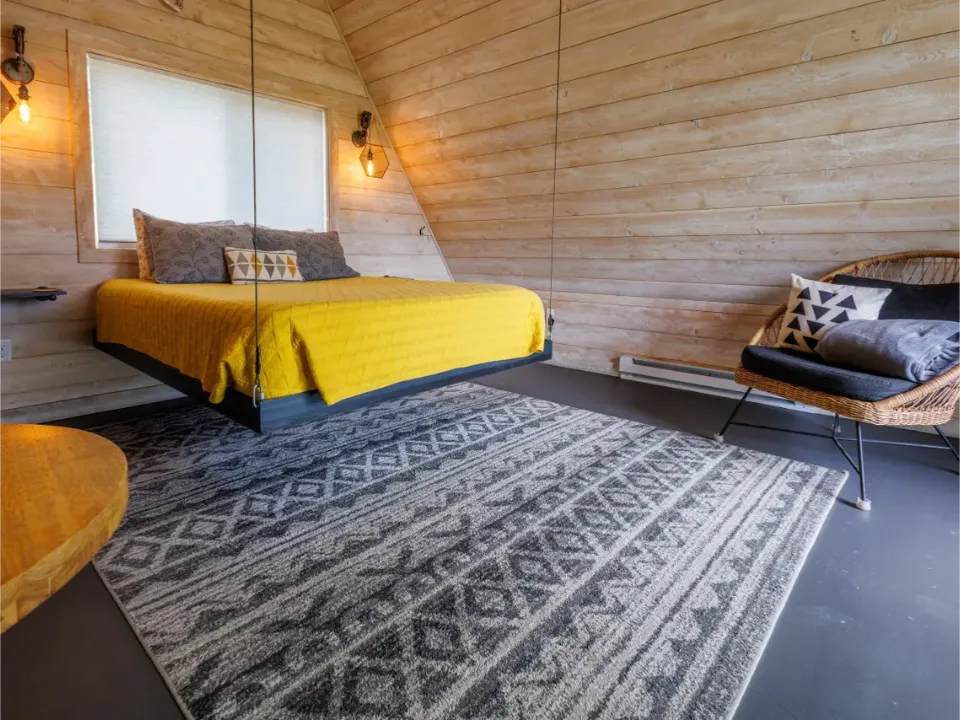 Our 10 custom-designed A-Frame cabins each offer approximately 250 sq ft of private sleeping space for 2 guests in a truly unique “farmhouse meets boho” style. Each cabin features a hanging queen bed, 2 comfy chairs, a table, AC/Heat, and all linens provided. A covered exterior patio (~80 sq ft) with chairs and a table extends your living space outdoors.